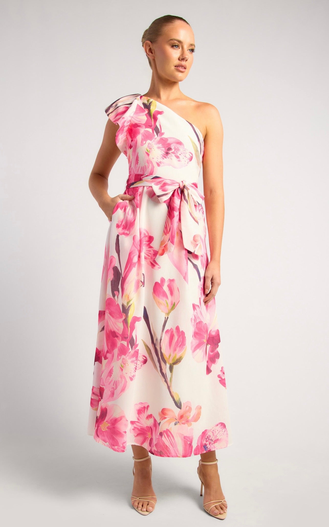 - Fitted bodice features A line skirt