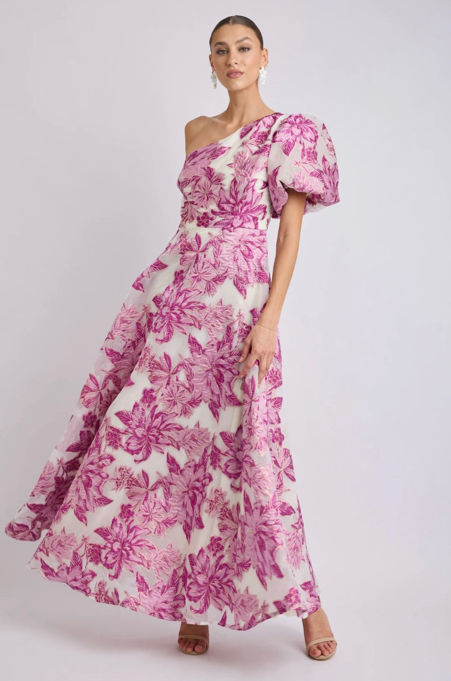 - Flattering one shoulder neckline features stunning puff sleeve